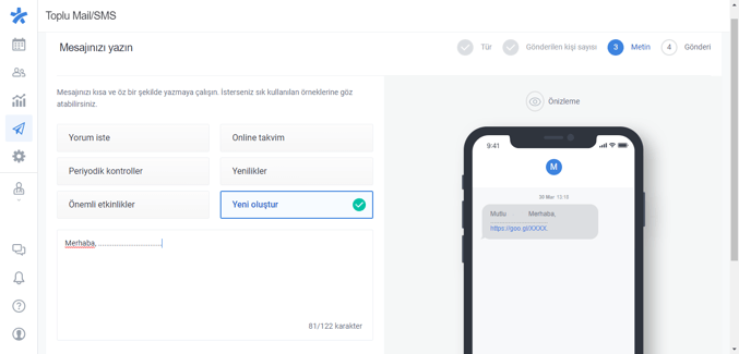 - Devam ettikten sonra, bu ekranda mesajınızın içeriğini hazırlayıp, hastalarınızda nasıl görüneceğini görüntüleyebilirsiniz,