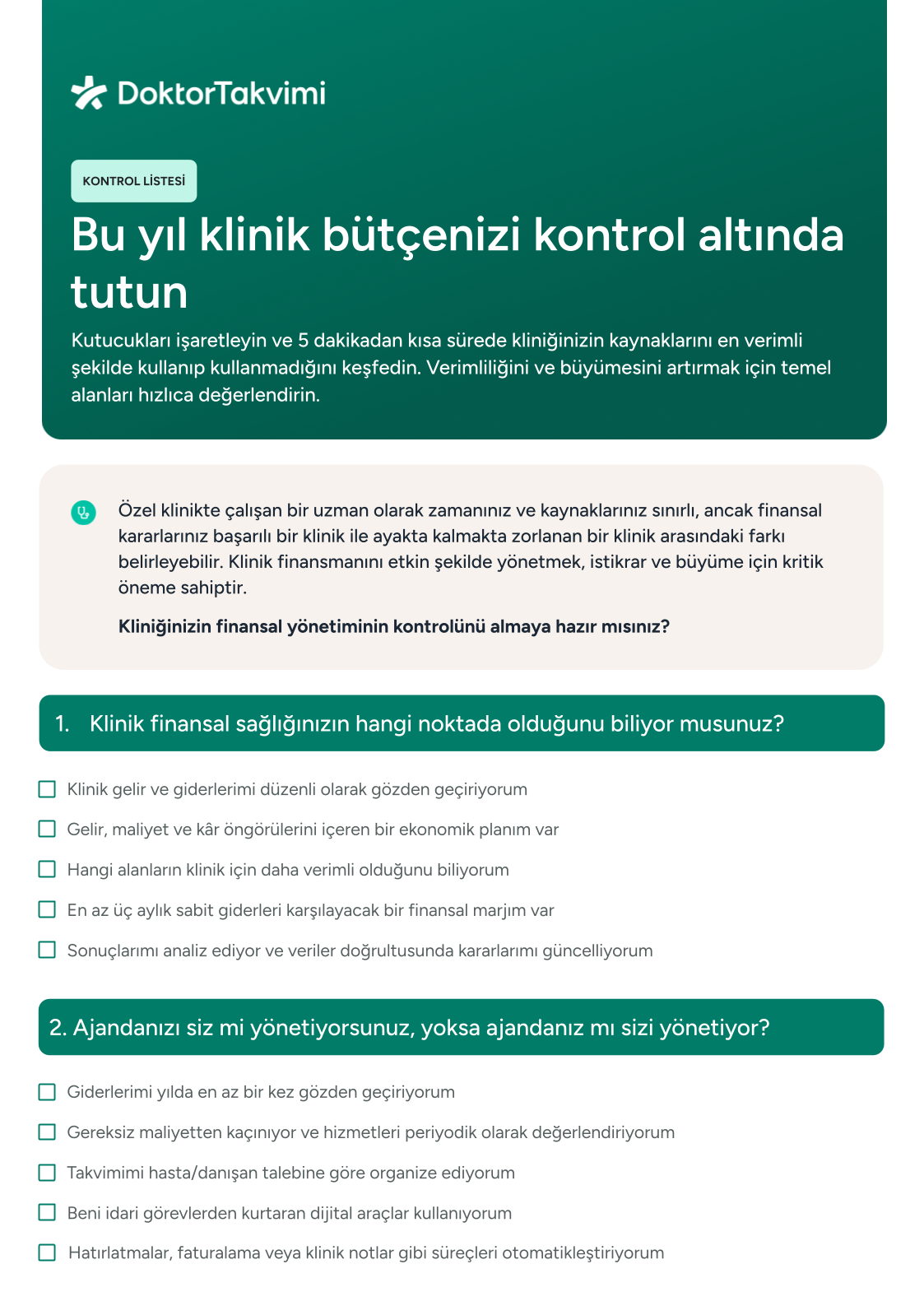 Sadece birkaç dakika içinde kliniğinizin gelir-gider dengesini, nakit akışını, zaman yönetimini ve finansal kontrol seviyesini değerlendirebilirsiniz. Bu kontrol listesi, iyileştirme fırsatlarını belirlemeniz, veri odaklı kararlar almanız ve daha organize, sürdürülebilir ve verimli bir klinik yönetimiyle yeni yıla hazırlanmanız için tasarlandı.